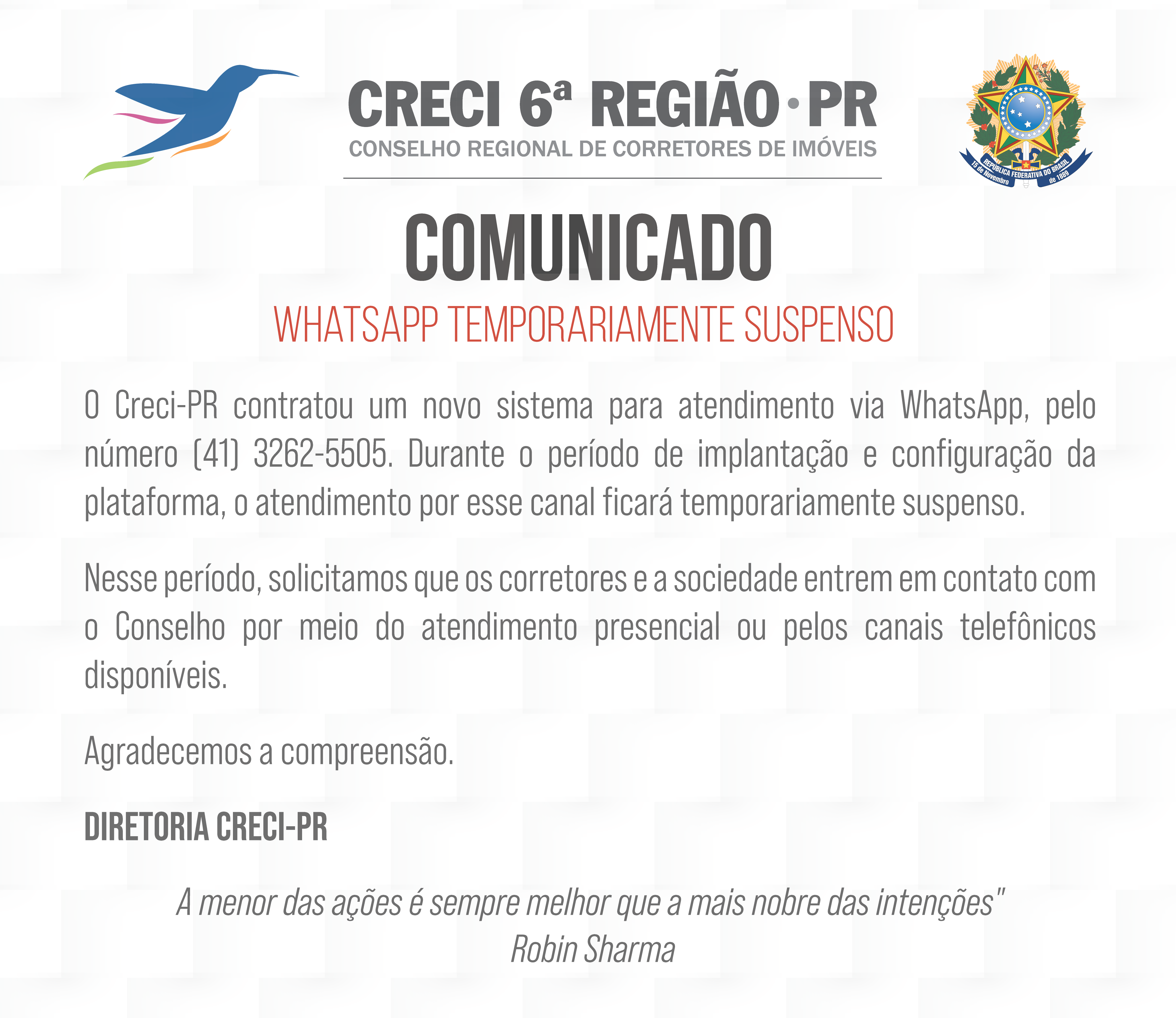 O Creci-PR informa que o Ato Solene de entrega das carteiras profissionais para as inscrições homologadas na sessão plenária de novembro de 2025 será realizado no dia 18 de novembro às 10h00.